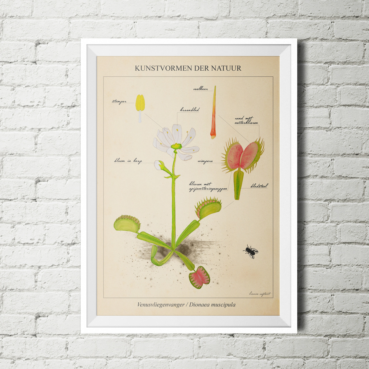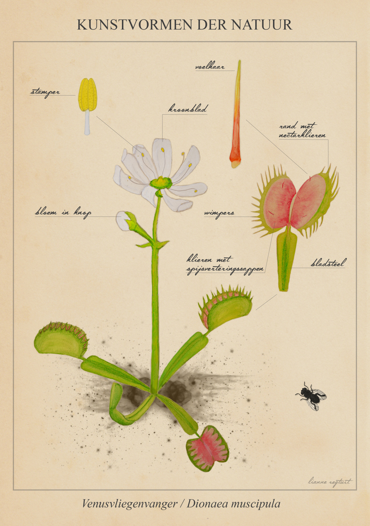 As a child, I would often find myself gazing at the biology posters displayed in my classroom. The information presented on these posters seemed to deeply resonate with me, and I found that I retained much of it as a result. Inspired by this, I sought to contribute to the education of others about nature. My goal was to create a biology poster that could seamlessly be displayed in a school classroom. This botanical illustration of a Venus flytrap was created as part of my final project concept. The artwork was executed using watercolor.