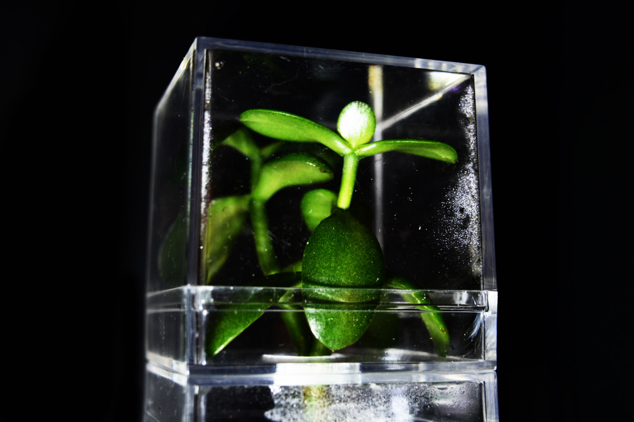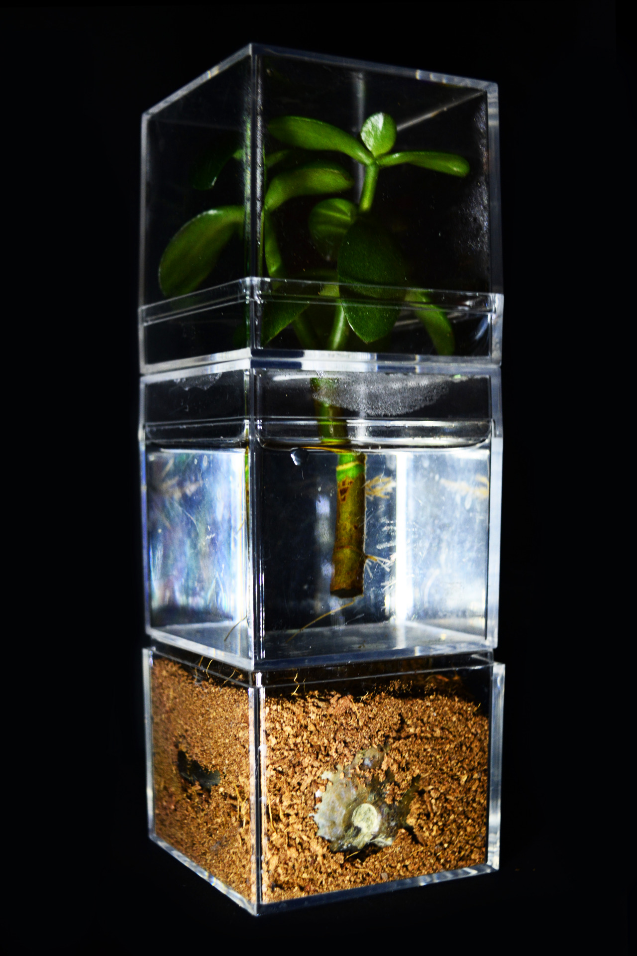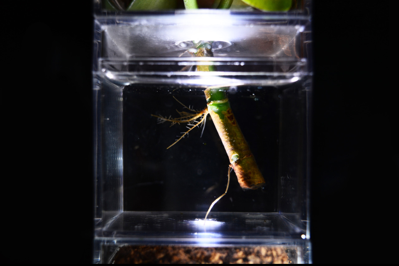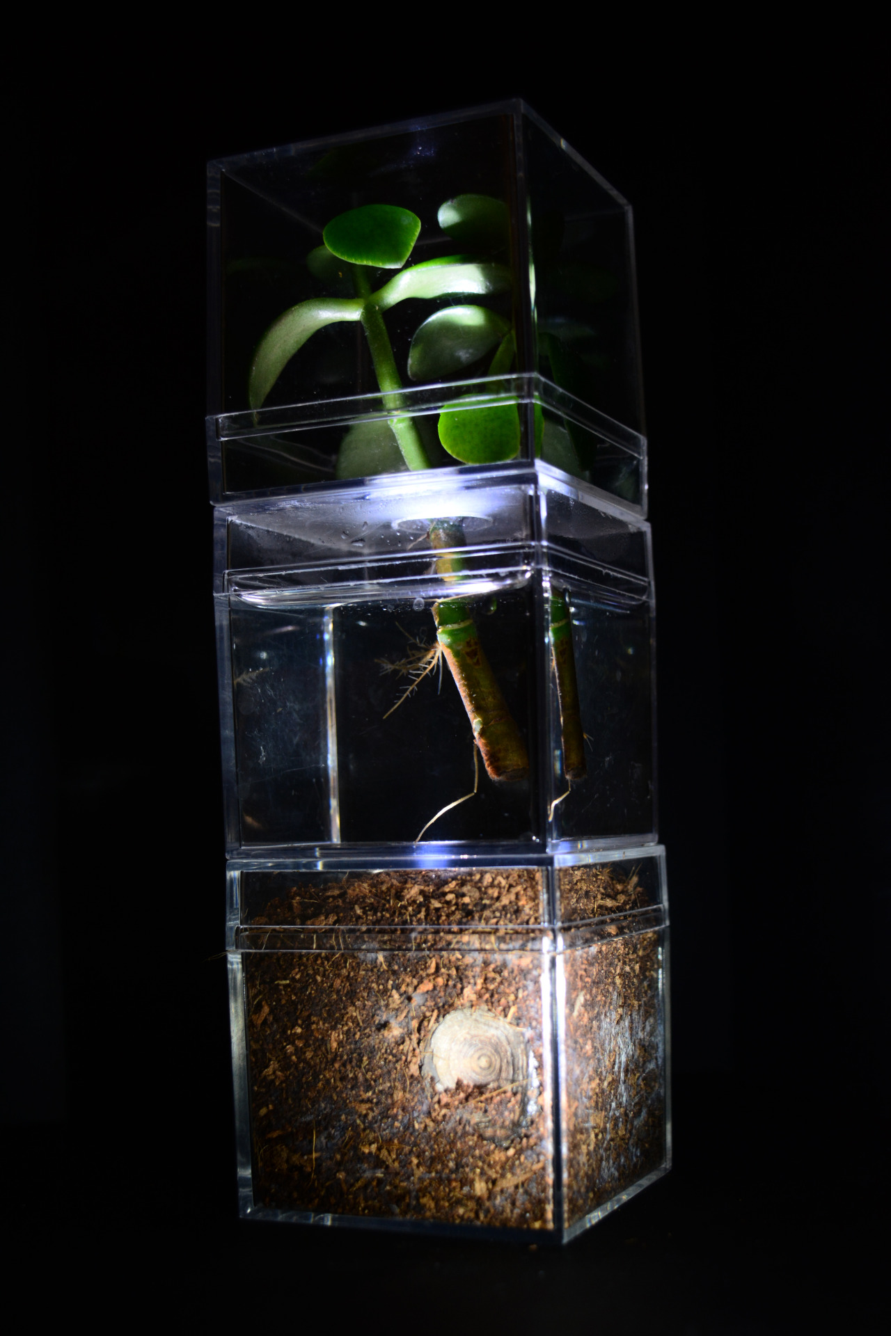 To develop this concept, I extensively experimented with the form of the artwork. I wanted to build a self-sustaining cycle within the piece, allowing an internal ecosystem to maintain itself. By placing the plant in water, it began to grow roots naturally, thriving without soil—living solely on water. I documented this development through a photo series capturing the various experimental phases that shaped the final design.